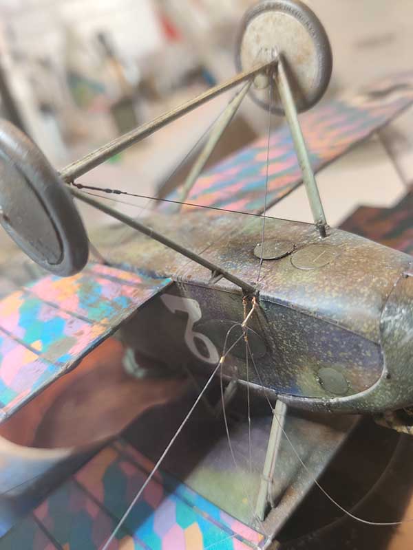 Ob, wie und wo man Turnbuckles nachbilden sollte ist ja so etwas wie die Gretchenfrage unter Modellbauern. Wingnut Wings rät explizit davon ab, mit dem Verweis darauf, dass Nachbildung oft aus dem Maßstab fallen. Ind er Community wird mittlerweile auf zahlreiche Lösungen in Form von Resinteilen, Photoetch, Messingröhrchen oder eine Kombination aus allem zurückgegriffen. Die Krux dabei ist: wie auf dem Foto zu sehen, waren die Turnbuckles in der Realität nur unwesentlich dicker als die zu spannenden Seile selbst.