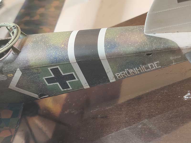 Nachdem ich den Rumpf ebenfalls mit einem Ölfilter etwas "ausgebleicht" und mit Mattlack versiegelt habe, habe ich die zwei fehlenden Decals für die außenliegenden Instrumente (Tacho und Treibstoffanzeige) aufgebracht.