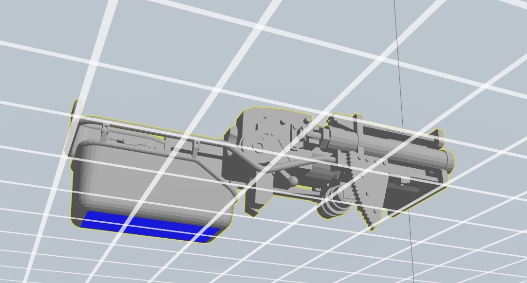 Am Stück zu drucken erfordert eine Menge Stützstrukturen, hier in Grün: