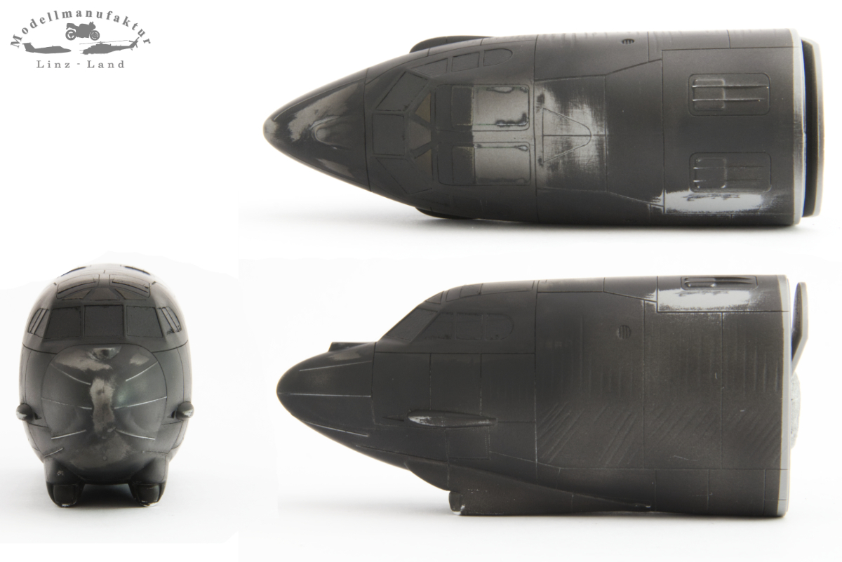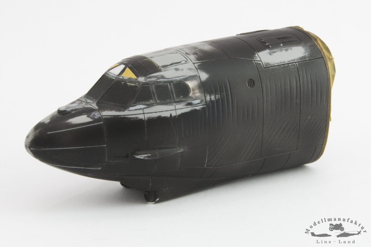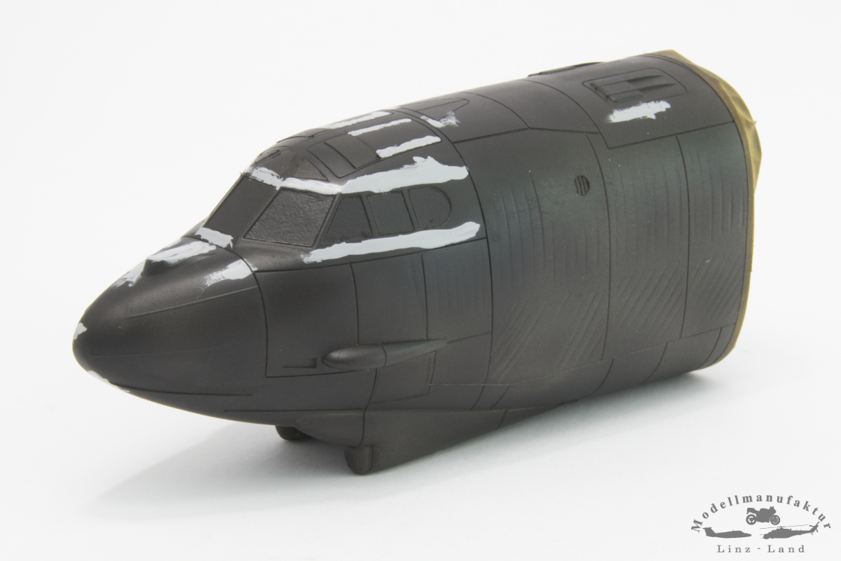 Zwischendurch habe ich dann noch die beiden letzten Details ergänzt. Die Luftbetankungsvorrichtung, bzw. ihre Klappen unterschlägt Modelcollect leider wieder komplett, ebenso wie das sehr auffällige Blech, mit dem das mittlere obere Fenster bei den späten Versionen verschlossen wurde.