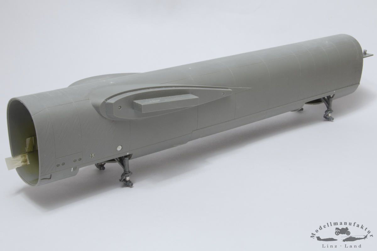 Die Segmente passten sehr gut zusammen, habe lediglich die Trennaht zwischen Mittelrumpf und Heckteil mittels gezogenem Gußast verschlossen, die vordere Trennstelle entspricht einer Panellinie.
