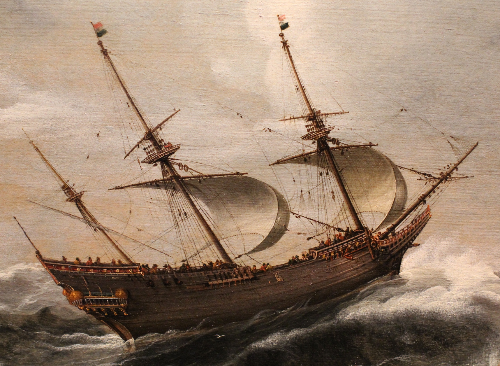 Ich bin kein Marinehistoriker. Meine Überlegungen sind die eines Amateurs und Dilettanten. Aber nach Durchsicht ich weiß nicht wie vieler Bücher und Internetseiten bin ich der Ansicht, dass diese hohen und freistehenden Türmchen kein besonders oft wiederkehrendes Element beim Bau der Schiffe in dieser Zeit waren. Vielleicht wollten die holländischen Schiffsbauer, die den Ludwig für Frankreich konzipierten und bauten, etwas tun, damit das Schiff schon von weithin als königlich wahrgenommen werden konnte. Im täglichen Gebrauch können diese Türme sich nicht bewährt haben. Man stelle sich nur vor, was mit ihnen passiert, wenn Sturm herrscht. Die Scheiben, so es denn welchesind, werden eingedrückt und der ganze Turm abgerissen! Ich habe die Türme an verschiedenen holländischen Schiffen zwarwiederfinden können, aber das sind es immer niedrige, halbe Türme, die sich in der Mitte der Galerie oder leicht nach hinten versetzt an die Bordwand schmiegen. Eigentlich sind es mehr Beulen als Türme. Hier ein Ausschnitt aus einem Gemälde, das ein englisches Schiff aus der Zeit des Ludwigs zeigen soll. Man erkennt eine gewisse Verwandtschaft, aber die Türme sind deutlich integriert.