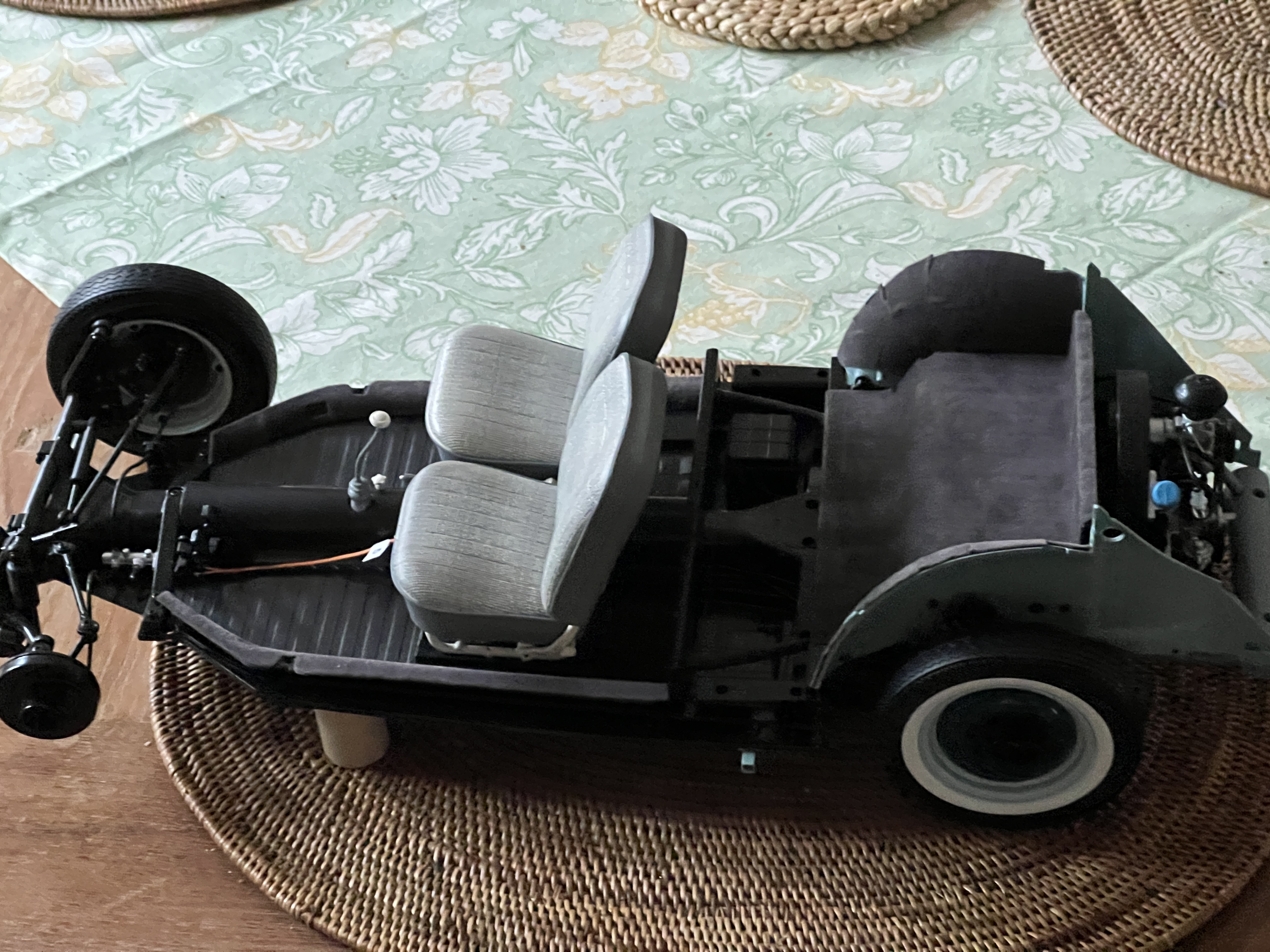 gestern habe ich meinem Käfer die ersten Teile des Teppichs gegönnt. Der graue Filz gefällt mir nicht und ich wollte mal was anderes ausprobieren. Auf dem Tunnel habe ich DC-Fix mit feiner Struktur verwendet.