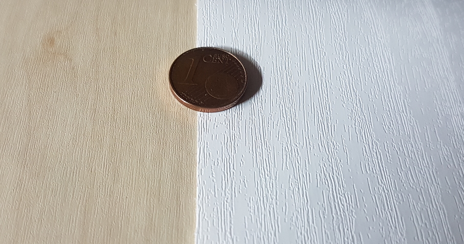 Es ist auf dem Bild etwas schwer zu erkennen, aber leider konnte ich es hier im Keller nicht besser fotografieren. Die Folie ist ein Fichte Imitat und relativ hell. Die farblich dargestellte Maserung kommt bei mir aber nicht zum tragen, da ich bekanntlich einzelne Streifen / Decksplanken schneide. Viel wichtiger ist mir ja die Struktur: