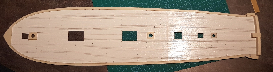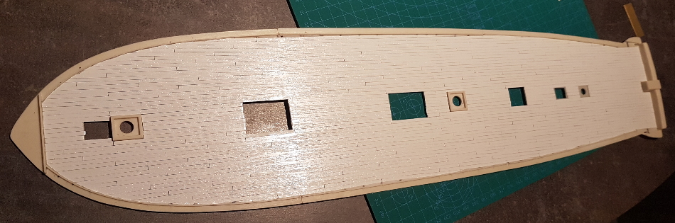 An den Rändern bin ich nicht ganz zufrieden, aber da man es später nicht mehr sieht lasse ich es so. Beim Oberdeck wird es leichter, da dort keine "Kanonenkante" ist. Das Oberdeck ist komplett glatt, abgesehen von den Süllkanten an den Grätings/Niedergängen, aber die entferne ich ja und ersetze sie durch eigene nach dem "beplanken".