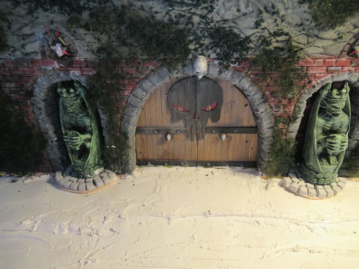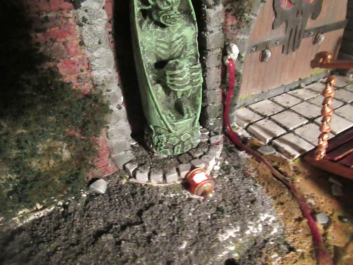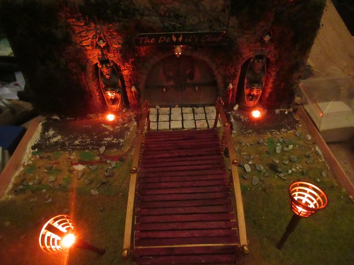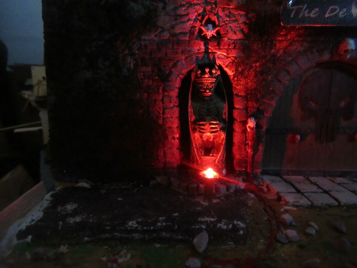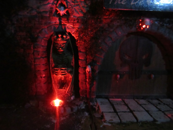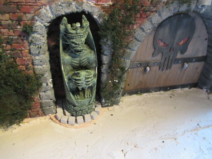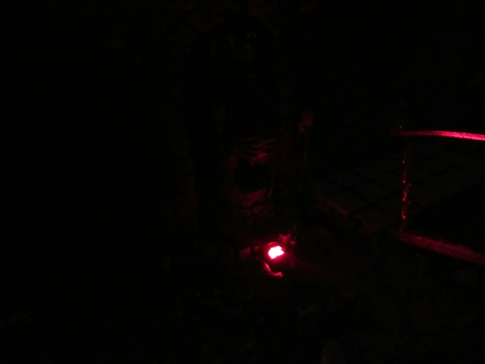 So und weil ich nun mal dabei war , wollte ich dann auch mal die beiden Statuen beleuchten . Hab zu erst mal probiert sie von hinter zu beleuchten , sah aber nicht gut aus . Dann also von vorne. Hatte da diese alten Schiffslampen liegen .