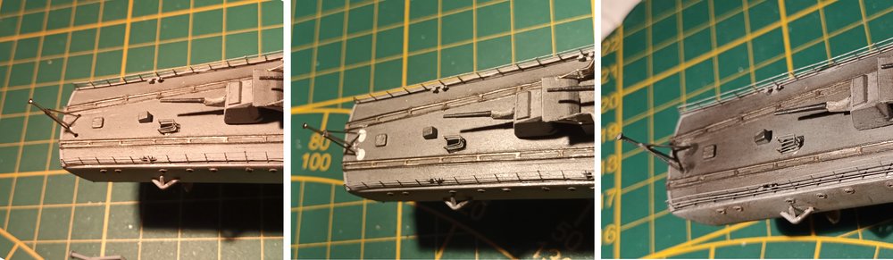 Diese werden nun für Flaggstöcke genutzt!Mir ist allerdings schleierhaft, warum die Stellen mit Putty nach der Bemalung mehr Weathering angenommen haben als das umgebene Areal...