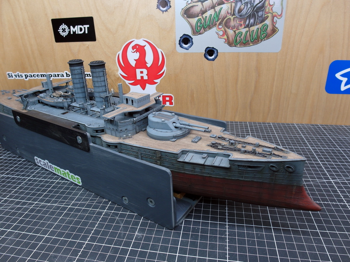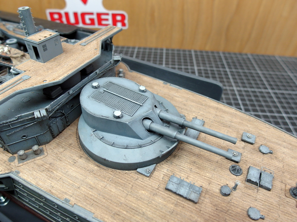 Beim einlegen der Türme in ihre Barbetten viel mein Augenmerk noch mal auf die Brückenhäuser mit den von mir abgewandelten Strukturen aus Styrenprofilen.