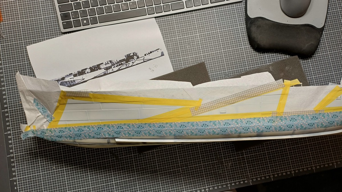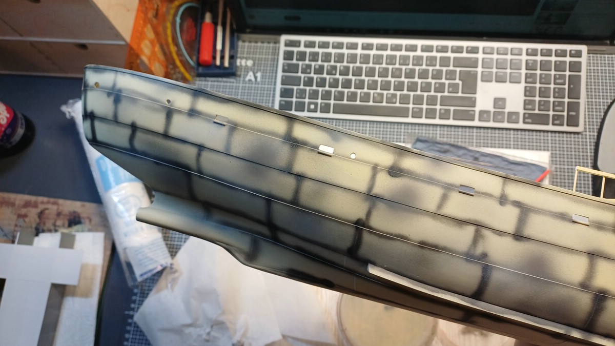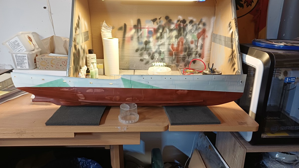 Hej, dachte ich mir, die Farbe ist ja schon trocken, dann kannst Du ja gleich das Unterwasserschiff lackieren, wenn die Airbrush-Gun eh schon eingesaut ist. Gesagt - getan. Und so habe ich Vollpfosten die Tarnflächen ausgepackt und das Unterwasserschiff abgeklebt ...