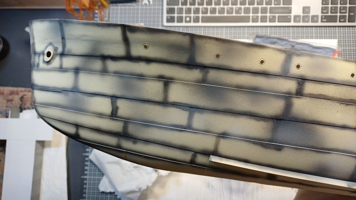 Ich bin sehr zufrieden. Das Preshading kommt noch gut durch und die paar Flecken ergeben eine feine Änderung der Farbe. An einigen Stellen erkennt man deutlich meine Umbaumaßnahmen. Stört mich jetzt nicht weiter, das wird in die Alterung mit einbezogen 8)