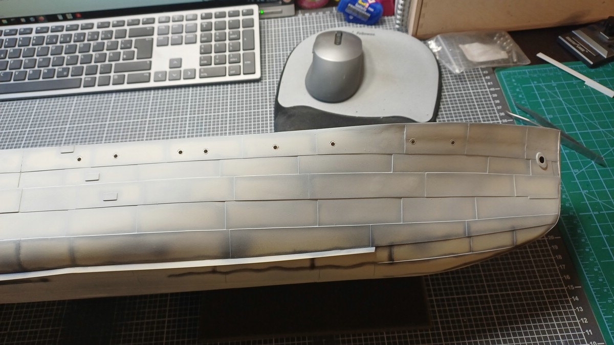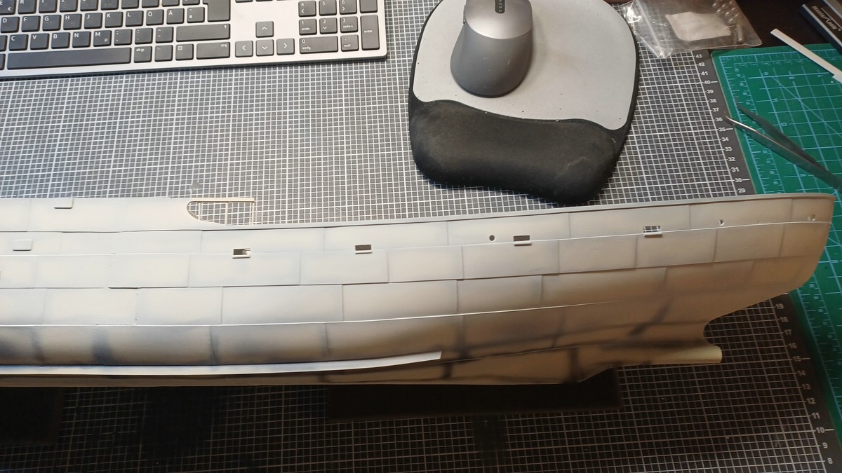 Dadurch, dass der Schlingerkiel nicht gepasst hat und ich ihn mit sanfter Gewalt in seine Form zwingen musste, gibt es zwischen den Rumpfhälften vermeintliche Unterschiede im Strak. An Steuerbord hat der Schlingerkiel ziemlich mittig einen deutlichen Knick, an Backbord dafür achtern kurz vor dem ersten, darüber liegenden Plattenstoß. Der restliche Strak des Rumpfes sieht ziemlich gut aus. Wenn man den Rumpf am Auge vorbei führt, (das geht hier online natürlich nicht) sieht man schön wie die Linien stimmig verlaufen.