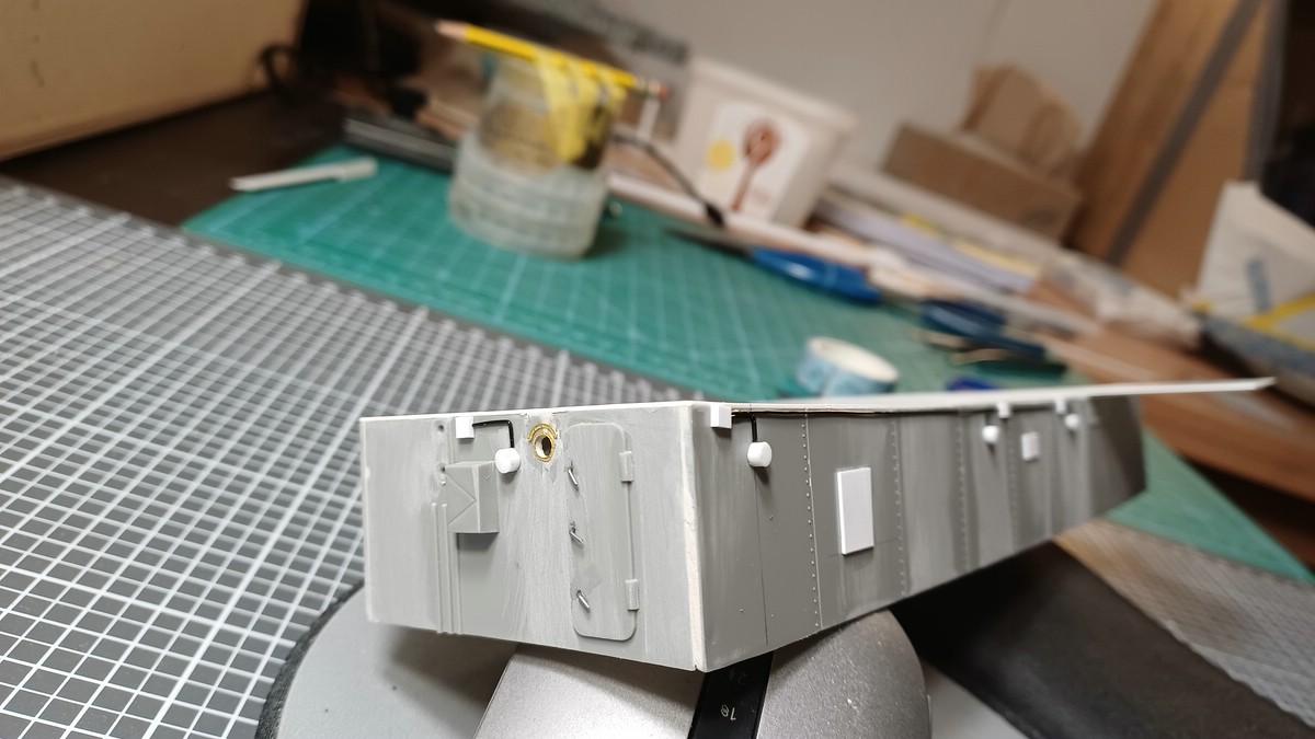 Erster Schritt war das Pimpen der achteren Deckaufbauten. Ein paar Lautsprecher, Anschlusskästen, Kabel und Abdeckungen. Dazu noch Vorreiber am Schott und die bekannten Bullaugen aus dem Great Little Ships PE-Satz: