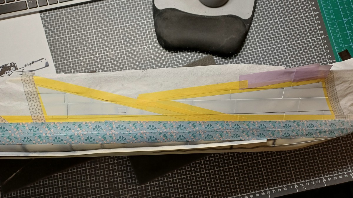 Dann ging es ans Abkleben des Tarnmusters. Zuerst habe ich mir einen Teil des bekannten Thorlock-Fotos ausgedruckt. Darauf hatte ich die Ränder der Tarnmuster mit dicken schwarzen Linien markiert, das Bild liegt unter dem Rumpf auf dem Tisch. Zum Abkleben selbst habe ich Tamiya-Band, so ein billiges Klebeband aus einem Krims-Krams-Laden sowie dünnes Papier genommen. Das Krims-Kram-Band hat dieselbe Dicke und Klebeeigenschaften wie das Tamiya-Band, lässt sich aber nicht so gut in Radien verarbeiten. Also verwende ich es nur für lange, gerade Stücke oder zum Fixieren des Papiers: