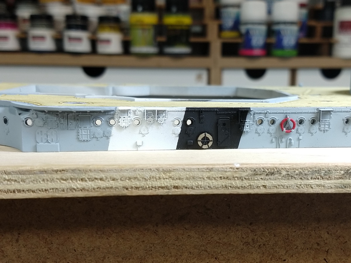 Ich kann mich sehr gut erinnern als ich das Baltic Tarnschema auf die Aufbauten der Bismarck angebracht habe. Diese waren mit Details voll gestopft und daher war ein Unterlaufen der Farbe fast unmöglich komplett zu verhindern. Auch auf dem folgenden Bild ist das so passiert.