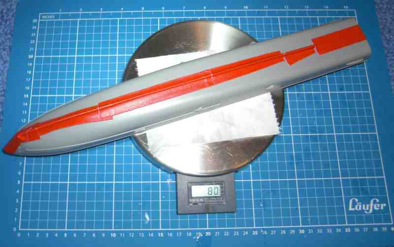 Klebe den Rumpf probvisorisch zusammen (Klebestreifen reichen) und markiere gut sichtbar die Wasserlinie. Dann ab damit ins Gewässer und Auflastung mit x-beliebigen Körpern, bis das Teil auf KWL (Konstruktionswasserlinie) schwimmt.