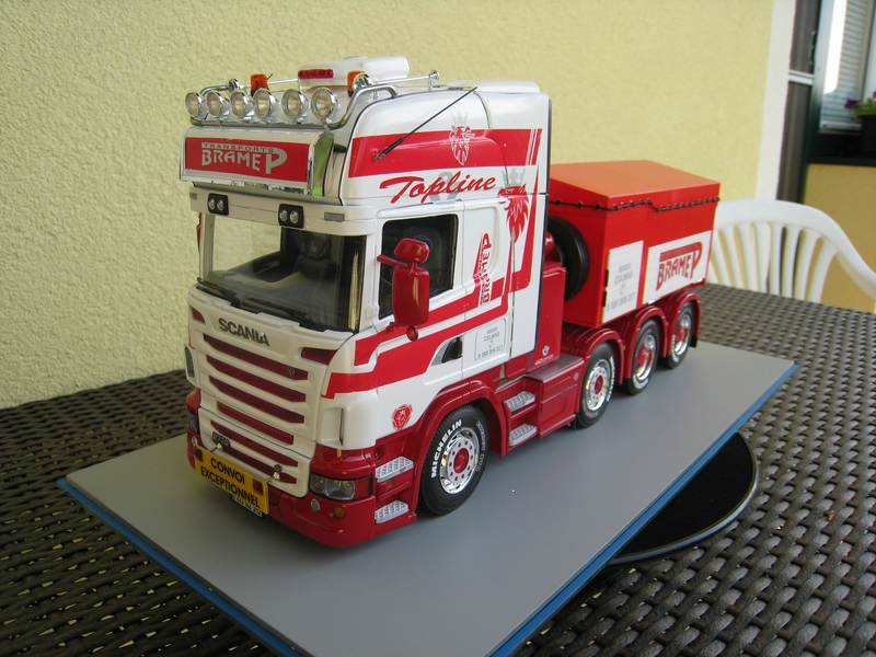 Hallo, einen hab ich noch heute, 4 Achs Schwerlastzugmaschine mit langem Radstand der französischen Firma BrameP aus Colmar. Bis zum Bau dieses Trucks waren/sind 4erScanias mit 580 PS im Sortiment dieser Firma, habe Ihnen eine neue Zugmaschine gegönnt !!!!!! Entstanden aus 3 Italeri Bausätzen, der Aufbau ist selbstgemacht, den Decalsatz bezog ich von Decalprint.de.Wieder nur MfG Siggi