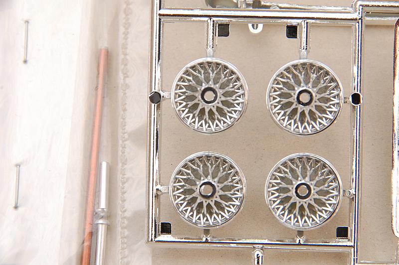Fazit: Der selten zu bekommende Bausatz ist sauber gegossen, nur an den Kotflügeloberkanten weist er starke Formtrennnähte auf. Die Speichenfelgen sind filigran und ordentlich verchromt. Die verchromten Außenspiegel weisen leider jeweils eine Auswerfermarke auf, die Stoßstangen sind seitlich so am Spritzling befestigt, daß nach dem Heraustrennen Chromfehlstellen bleiben. Der Glasspritzling ist klar und ohne Schlieren, der Decalsatz sauber und klar gedruckt. Die Karosserie ist so vorbereitet, daß man das Dach und das Schutzschild heraustrennen kann. Ein Schutzschild für die Montage im ausgefahrenen Zustand fehlt jedoch