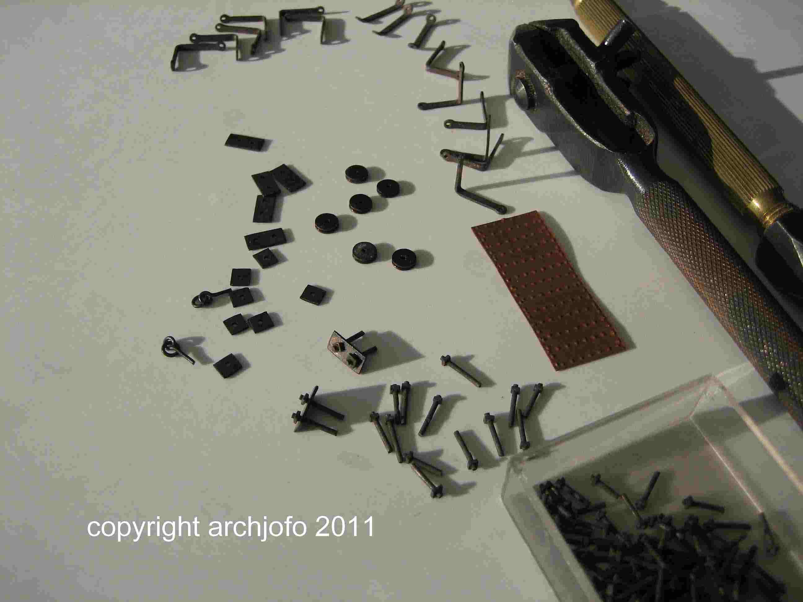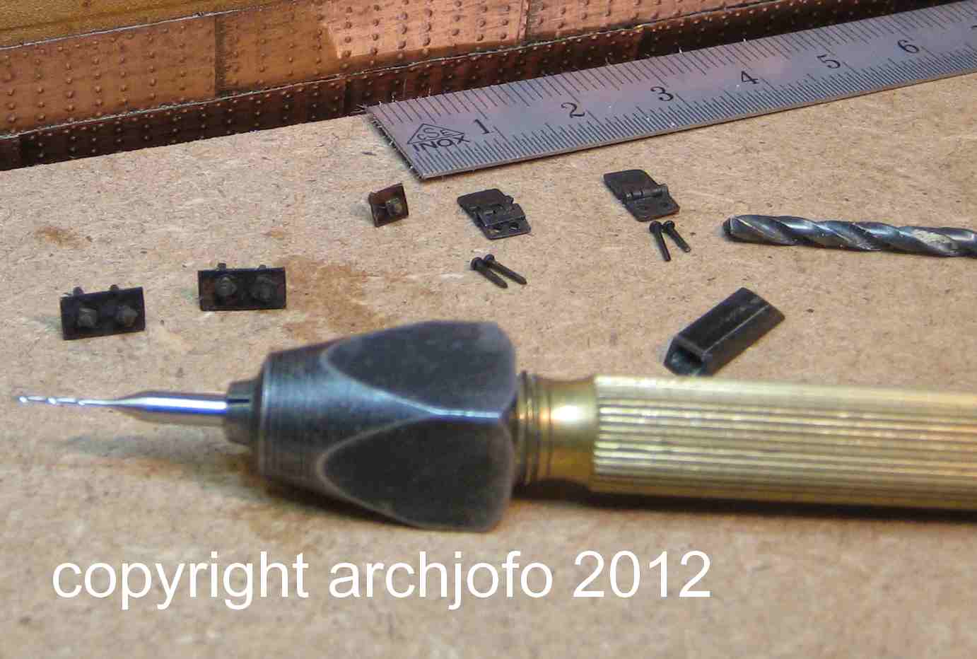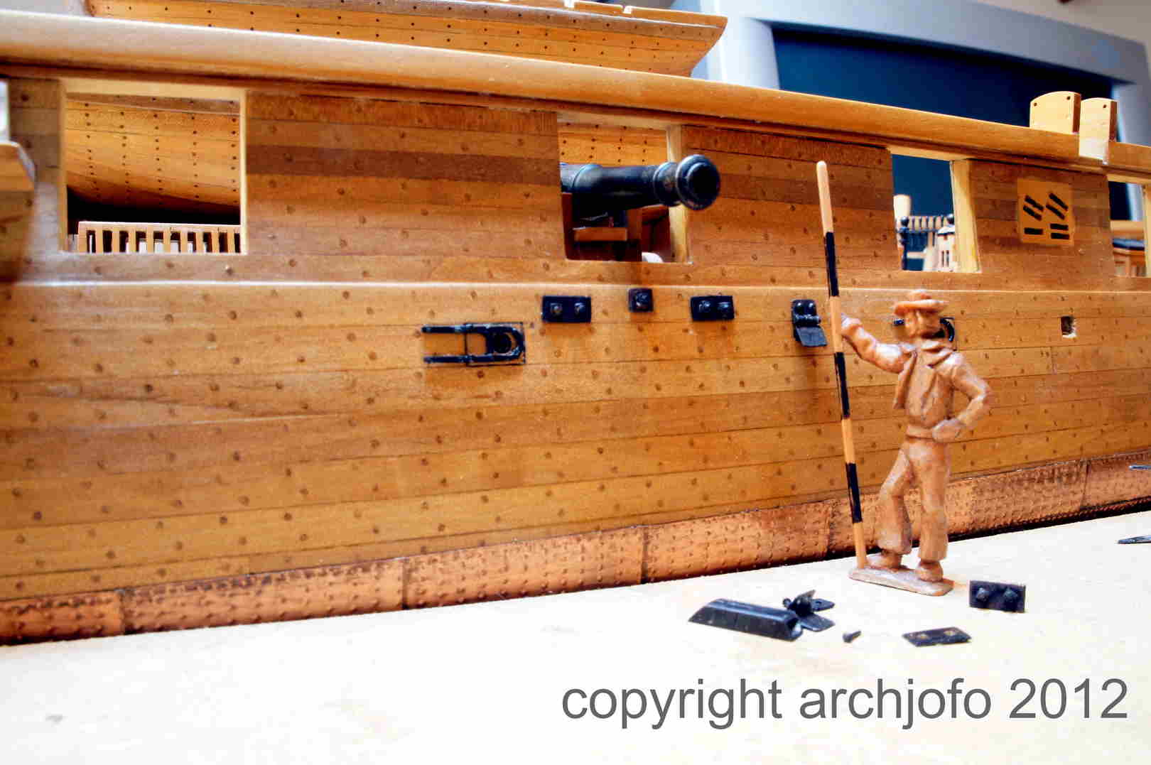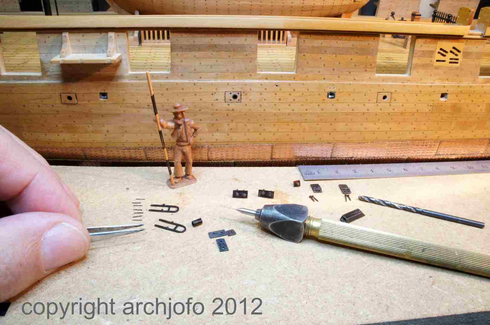 Die Befestigung der Beschläge für die Belichtungs- und Belüftungspforten (keine Riemenpforten, wie ursprünglich angenommen), die das Unterdeck mit spärlichem Licht versorgen und beim Öffnen eine geringe Querlüftung ermöglichen, erfolgt mit kleinen Bolzen. Diese haben einen Schaft mit 0,3 mm Durchmesser, wobei der Kopfdurchmesser der Bolzen bzw. Nieten 0,5mm beträgt. Dazu müssen noch 8 Bohrungen mit einem Durchmesser von 0,3 mm in diese Beschläge gebohrt werden. Das ist eine sehr diffizile Angelegenheit, da die Materialbreiten der Beschläge unter einem Millimeter liegen.