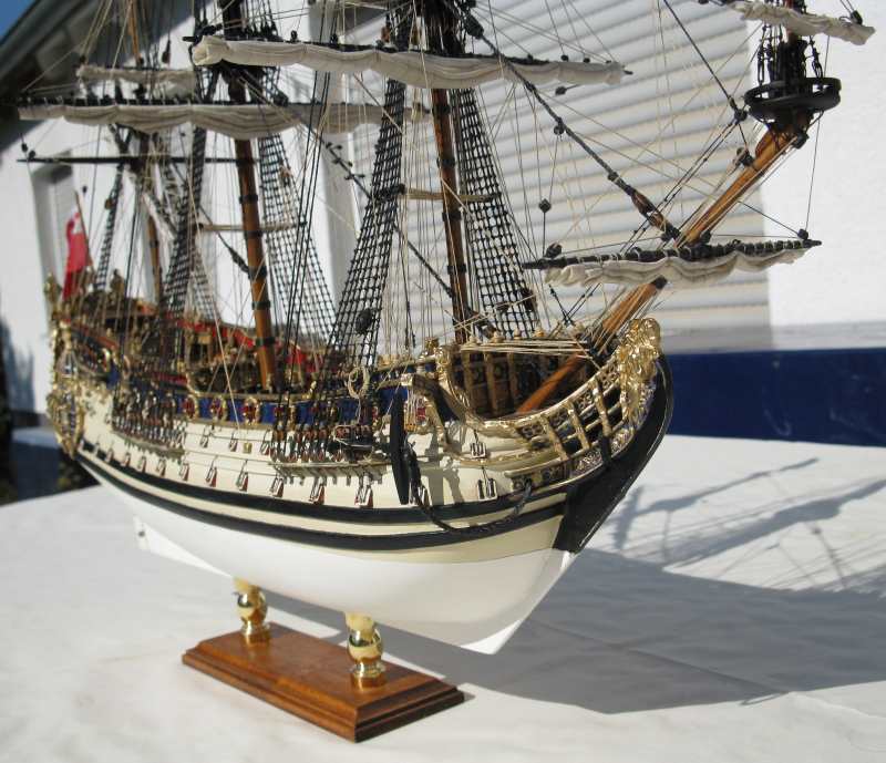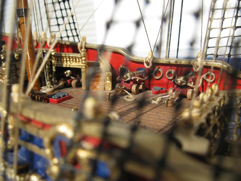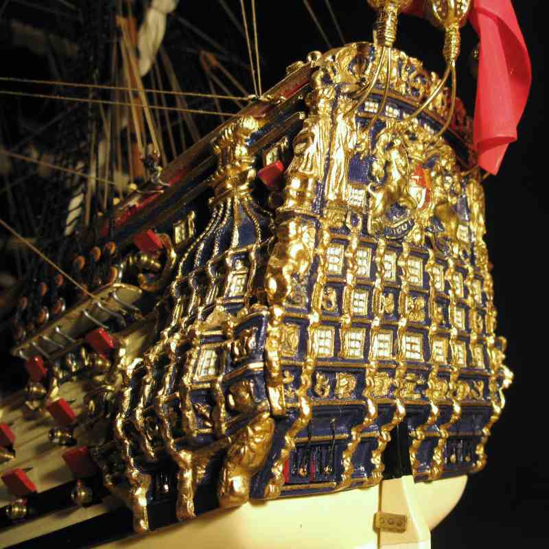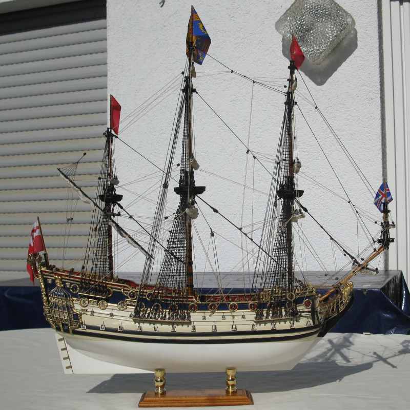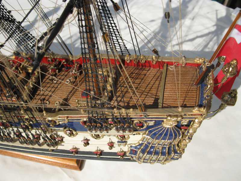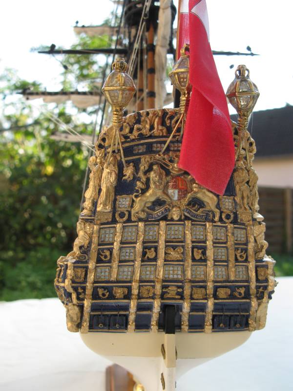 @ Chris: N´Abnd Majestät! Der Bausatz stammt aus den 90er Jahren, deshalb ist er heute nicht mehr sehr bekannt. Nichts desto trotz kann man ihn heute immer noch für 279,- Euro kaufen (sogar einen fertig genähten Segelsatz kann man für 78,- Euro dazu kaufen - wenn man sowas braucht). Falls jemand Interesse daran hat kann ich Ihm gerne die Händlerinformationen zukommen lassen. Der Heckspiegel, die Seitentaschen und viele andere Verzierungen sind aus sogenanntem Holzplastik. Das ist so ein Holzmehlpresszeugs. Läßt sich ziemlich gut bearbeiten. Die Größe der Belegnägel ist nicht der einzige Fehler bei diesem Bausatz. Die Kanonen sind eigentlich auch zu groß und es gab noch viele weitere maßstäbliche und andere Fehler (z.B. völlig falsche Takelung). Viele davon habe ich korrigiert. Als Referenz diente mir dazu das Dockyard Modell im Science Museum in London. Aber alles konnte ich nicht beheben.