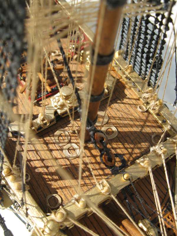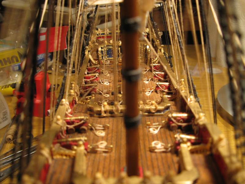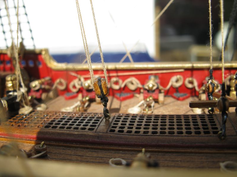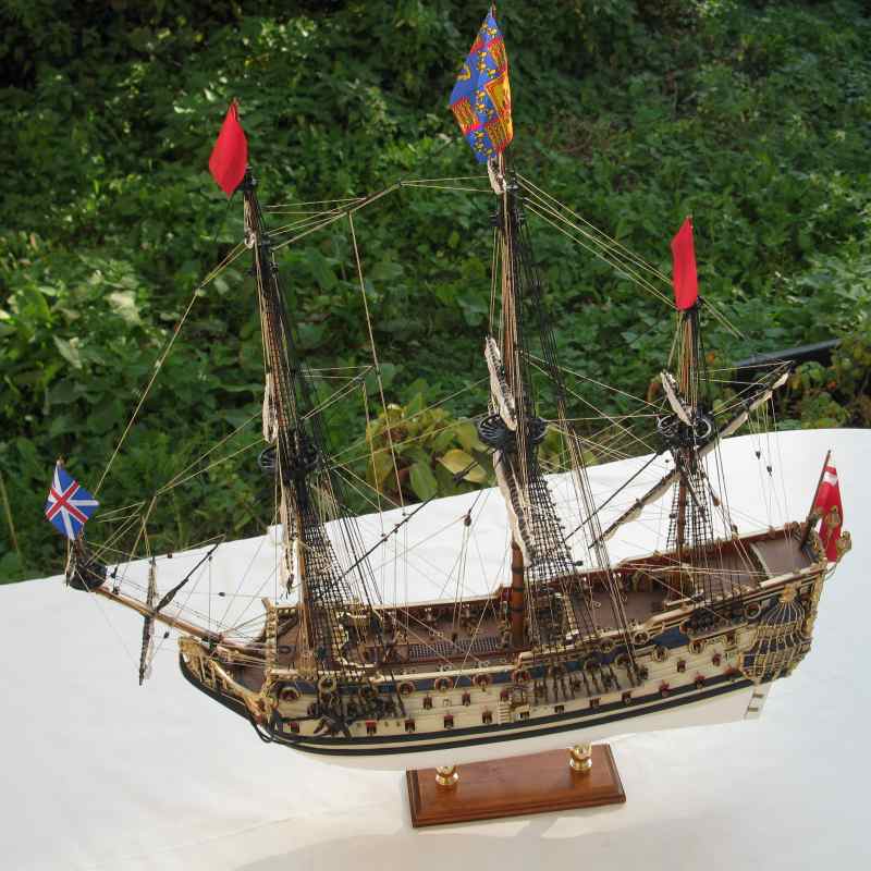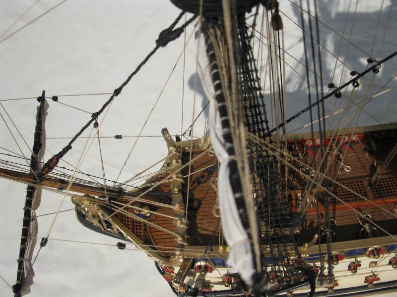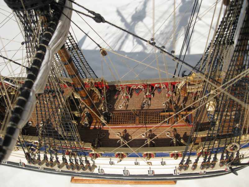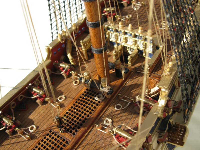 @ Chris: N´Abnd Majestät! Der Bausatz stammt aus den 90er Jahren, deshalb ist er heute nicht mehr sehr bekannt. Nichts desto trotz kann man ihn heute immer noch für 279,- Euro kaufen (sogar einen fertig genähten Segelsatz kann man für 78,- Euro dazu kaufen - wenn man sowas braucht). Falls jemand Interesse daran hat kann ich Ihm gerne die Händlerinformationen zukommen lassen. Der Heckspiegel, die Seitentaschen und viele andere Verzierungen sind aus sogenanntem Holzplastik. Das ist so ein Holzmehlpresszeugs. Läßt sich ziemlich gut bearbeiten. Die Größe der Belegnägel ist nicht der einzige Fehler bei diesem Bausatz. Die Kanonen sind eigentlich auch zu groß und es gab noch viele weitere maßstäbliche und andere Fehler (z.B. völlig falsche Takelung). Viele davon habe ich korrigiert. Als Referenz diente mir dazu das Dockyard Modell im Science Museum in London. Aber alles konnte ich nicht beheben.