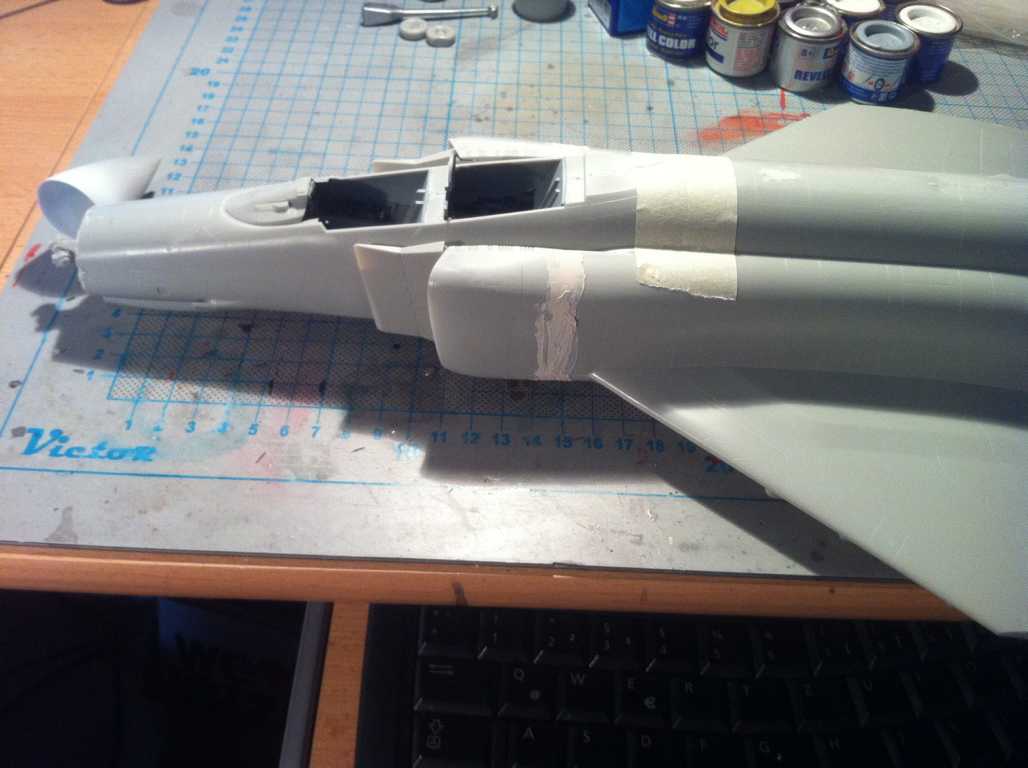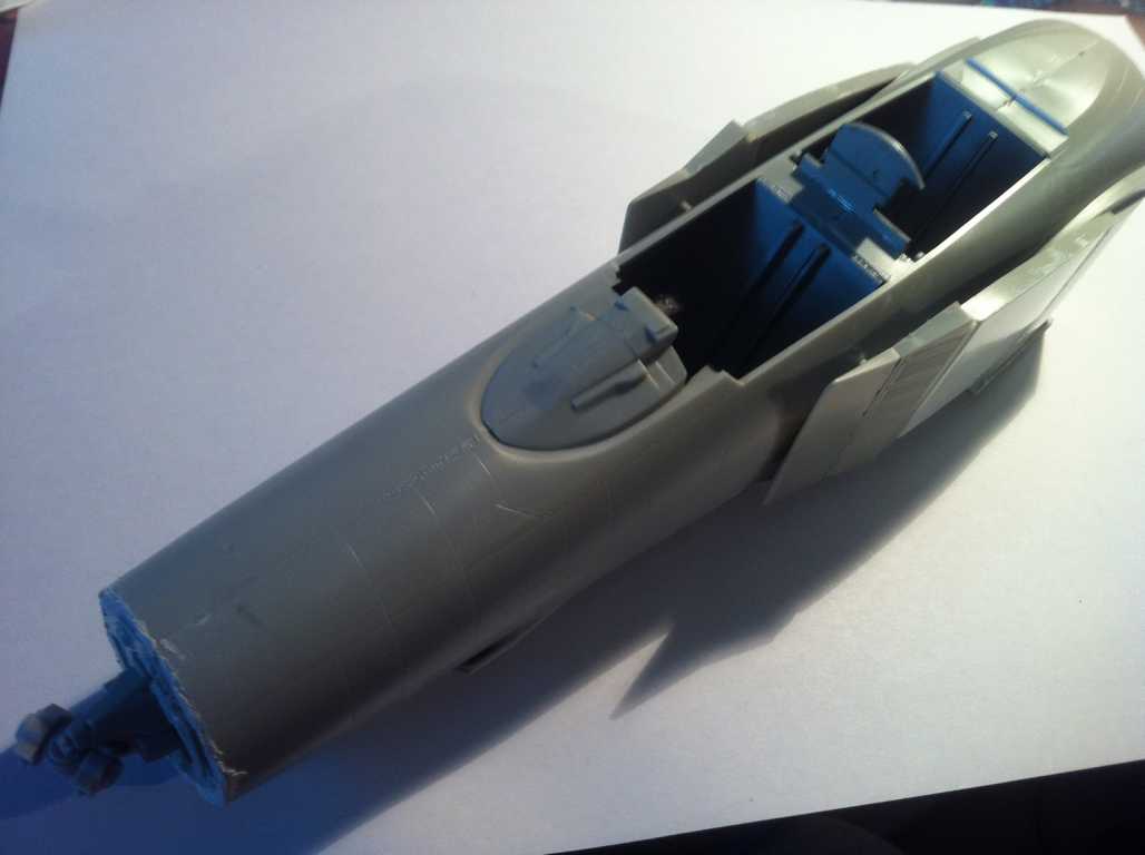 Dann wurde das Rumpfvorderteil mit dem Hinterteil vereinigt, das gibt aber auch definitiv viel Spachtelarbeit...
