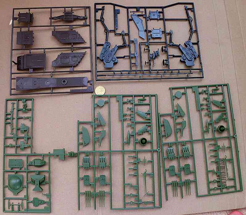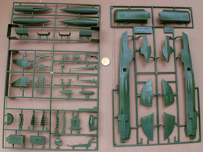 Spritzlinge: 5 grüne, 2 schwarze (Ständer), 1 brauner (Heck), 1 weisser, 1 gelber KLarsicht und 1 Gummi (für Geschütztürme)
