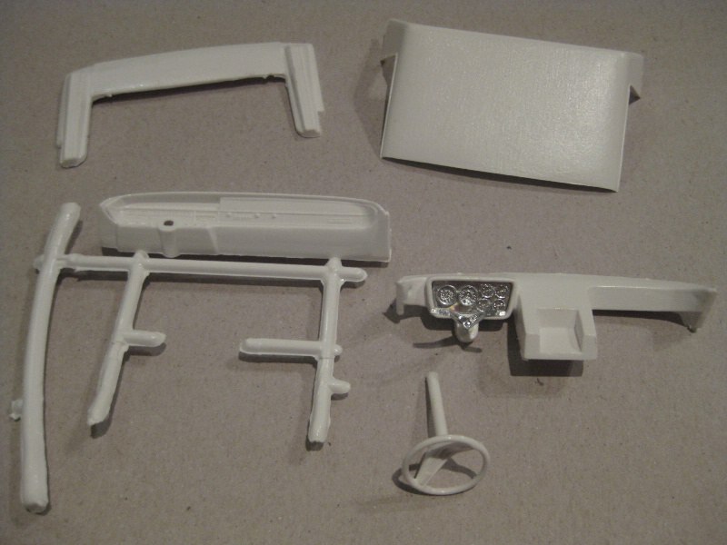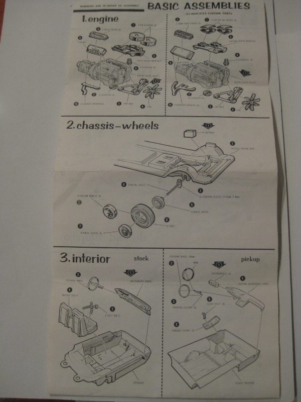 Wahlweise kann ein Convertible in Stock oder Custom oder ein Pickup gebaut werden, dafür sind 2 verschiedene Cockpit Schalen im Karton. Mit ein bisschen Geschick kann man das Pickup dach verlängern und ein Coupe bauen. 2 Motoren, Innenraumdetails, Frontgrill und Heckstoßstangen, Felgen usw. stehen zu Auswahl. Die Decals sind für ihr Alter perfekt in Schuss, genauso wie die Holznachbildung in Form von Aufklebern.