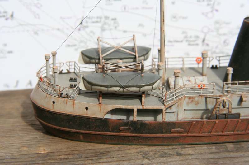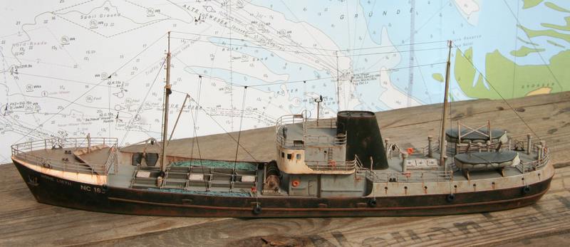 Alte Fotos von Seitentrawlern zeigen diese oft in einem desolaten Zustand - sowas wollte ich auch darstellen. Besonders die Steuerbordseite wurde im täglichen Fangbetrieb stark in Mitleidenschaft gezogen, da das Fangnetz über diese Seite ins Wasser gelassen und wieder eingeholt wurde. Als Vorbild für die starken Rostspuren diente mir u.a.