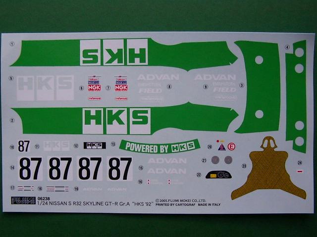 Der Bausatz des Nissan BNR32 Skyline GT-R Gr. A´92 „HKS“ gibt ein Fahrzeug einer Asiatischen Rennserie aus dem Jahr 1992 der Gruppe A wieder. Die Bausatzteile sind durchweg in einer guten Qualität gespritzt worden. Nur wenige Bausatzteile weisen leichte Gussgrate auf und erfordern etwas Nacharbeit. Die Detaillierung der Teile ist sehr gut. Die Bremsscheiben sind gelocht, die Achsaufhängungen sind sehr detailliert und am Chassis ist der Antriebsstrang sehr gut dargestellt worden. Auch die Innenraumwanne weiß zu gefallen. Das Armaturenbrett liegt in einer zivilen Rechtslenker Version bei und wird erst durch hin Zugabe eines Bausatzteiles zu einer Renn Version. Auch der Spoiler am Heck ist obligatorisch, da erst noch Löcher für ihn gebohrt werden müssen. Dadurch lässt sich der Nissan Skyline auch leicht in einer zivilen Version bauen. Lediglich ein zweiter Sitz wäre nötig. Leider ist im Bausatz kein Motor enthalten. Die Karosserie ist sehr sauber gegossen worden und glänzt sehr schön. Man könnte den Nissan dadurch auch fast ohne Lackierung bauen.