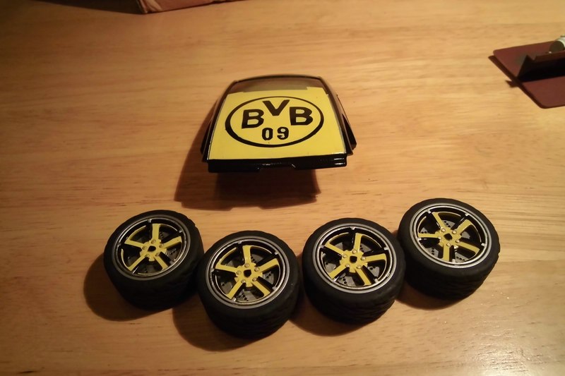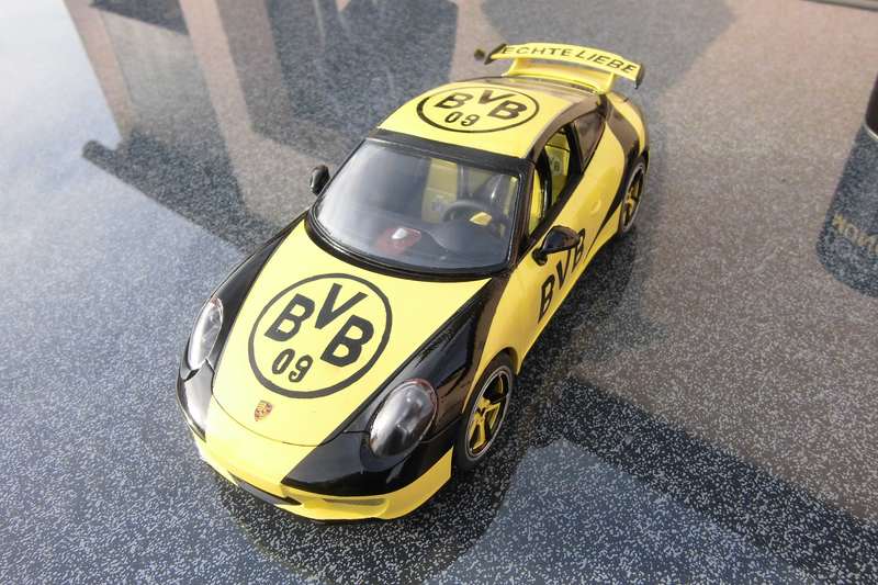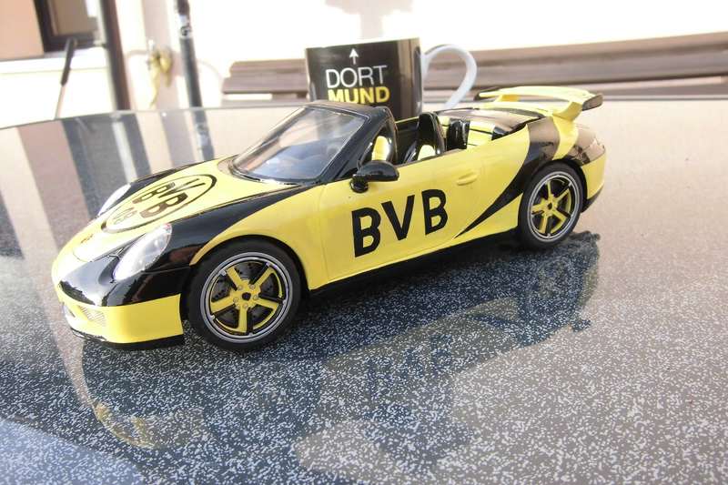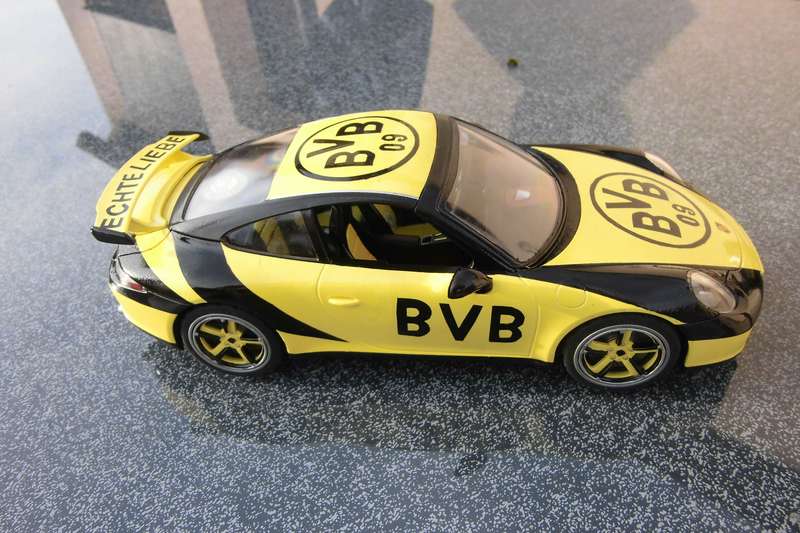 Das war ein "Fehler", ein "großer Fehler", denn er griff das sofort auf und sagte mir, da ich doch so toll (ok Kinder sehen das anders als wir Erwachsenen) lackieren könne, solle ich doch aus seinem Porsche in rot einen BVB-Porsche machen.