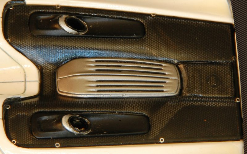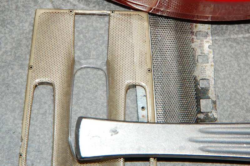 Also den Bereich unterhalb der Rücklichter ausgefräst und das Gitterdecal auf ein Stück Verpackungsblister aufgeklebt und anschließend von der Karosserieinnenseite eingeklebt