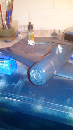 Habe dann das ganze großflächig mit dem Verdünner abgewischt um keine unerwünschten Erhebungen durch den Klarlack bzw. das angegriffene Material zu erhalten. Nun muss ich natürlich den Flügel neu lackieren (Grundierung ist geblieben, Gravuren, Nieten & Panelines auch, also nur Hauptlack ab).