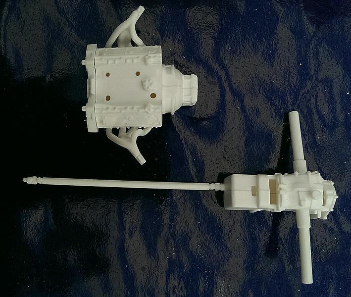 Dann wurden die ersten Motor und Antriebsteile verklebt. Hier werde ich mich nicht lange aufhalten und auch hinsichtlich der Bearbeitung und Bemalung keinen großen Aufwand betreiben. Erstens sieht man hinterher eh nichts mehr davon und zweitens ist der Motor eh ein Fantasiegebilde und hat mit dem Originalmotor nicht viel gemeinsam.