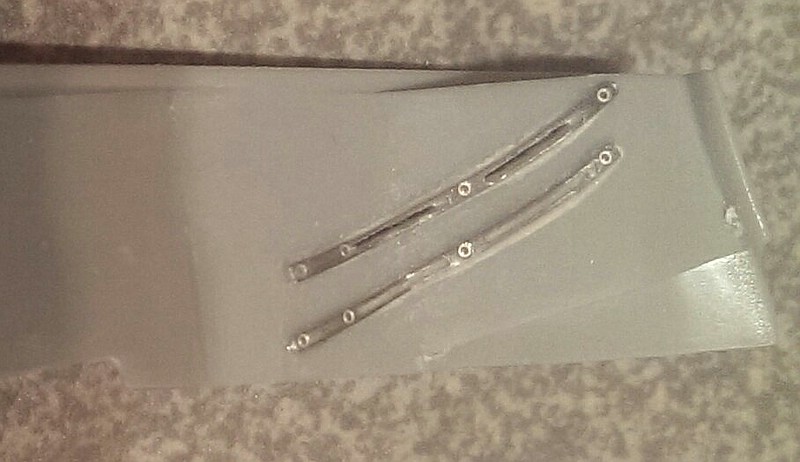 . Die wird sicherlich noch einfallen, aber das macht nichts, es muss eh nochmals nachgespachtelt werden. Außerdem muss die Spachtelei diesmal eh nicht 100 %ig werden, denn genau auf den Bereich der Spachtelmasse werden ja die Ätzteilhalterunge geklebt.