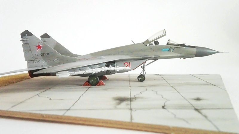 Liebe Kollegen, hier noch eine weitere Neuigkeit meinerseits. Es handelt sich um die Mig-29S "9-13" vom Hersteller Zvezda. Es wurde "out of the box" gebaut. Nur das Plastik-Staurohr wurde ersetzt durch ein Selbstgemachtes aus zwei verschiedenen Injektionsnadeln. Das hintere Fahrwerk wurde um 2mm gekürzt, damit die Mig-29 ihre typische herabhängende Parkposition erhält, und weil Zvezda, wie auch Trumpeter und alle Anderen in jeglichem Maßstab immer wieder den gleichen Fehler wiederholen und nie korrigieren wollen. Die Farben für das Mig-29 Grau und Graugrün, sowie für die Schubdüsen wurden von mir selber angemischt unter Verwendung von Italeri Acryl Farben.