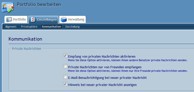@Tommy: geh auf "Portfolio bearbeiten", den Reiter "Einstellungen" wählen und dann auf "Kommunikation" klicken: