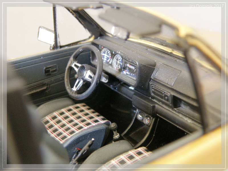 Ursprung war ein GTI-Bausatz, den ich schon fast fertig relativ günstig schoß. Die Karosserie war regelrecht mit Klarlack zugeschwemmt (natürlich voll dacaliert), der Innenraum sowie Motor und Fahrwerk soweit fertig, so wie es zu sehen ist. Da mochte ich keine Hand an Verbesserungen anlegen.