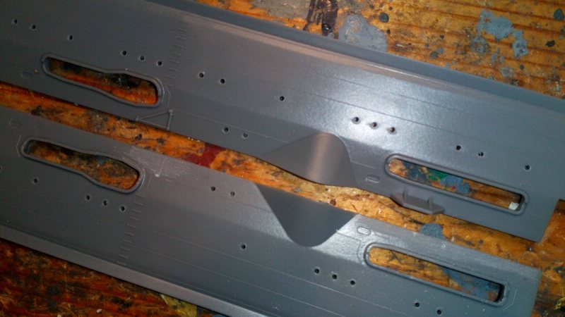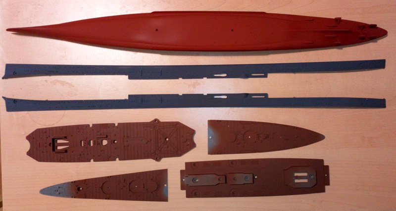 Ein probeweises zusammensetzen der Rumpfteile ergab absolut perfekte Passung, ich werde die Teile also vor dem Zusammenbau lackieren. Die Trennkante entspricht nämlich genau der Farbkante, und praktischerweise hatten IJN-Schiffe keinen Wasserpass.