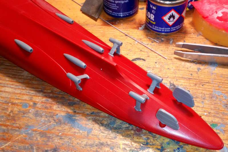 Damit kann der Rumpf zusammengebaut werden, und dann hat erstmal der angespitzte Einhaarpinsel das Wort, Unmengen Kleinkram auf den Decks bemalen.