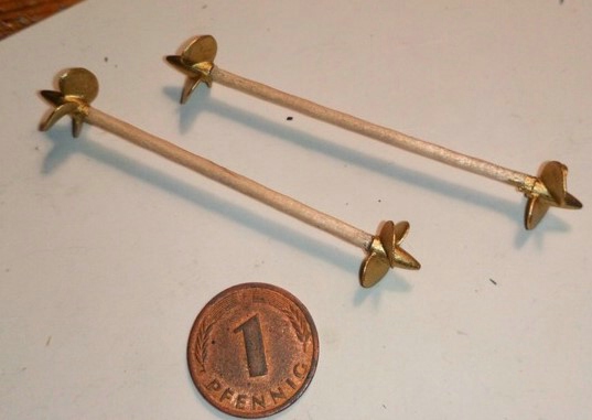 Ruder sind beweglich eingesteckt, die Antriebsteile passen perfekt. Schraubenwellen aus Rundstahl, werden nach dem lackieren eingesetzt.