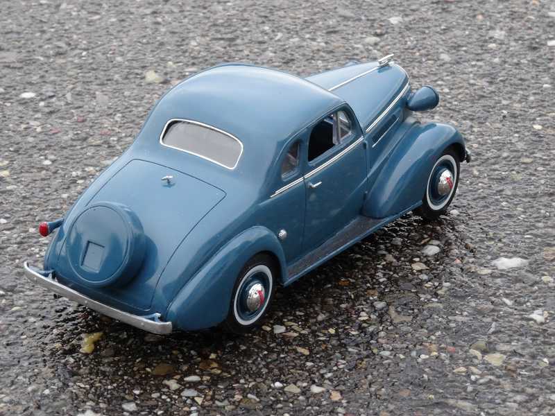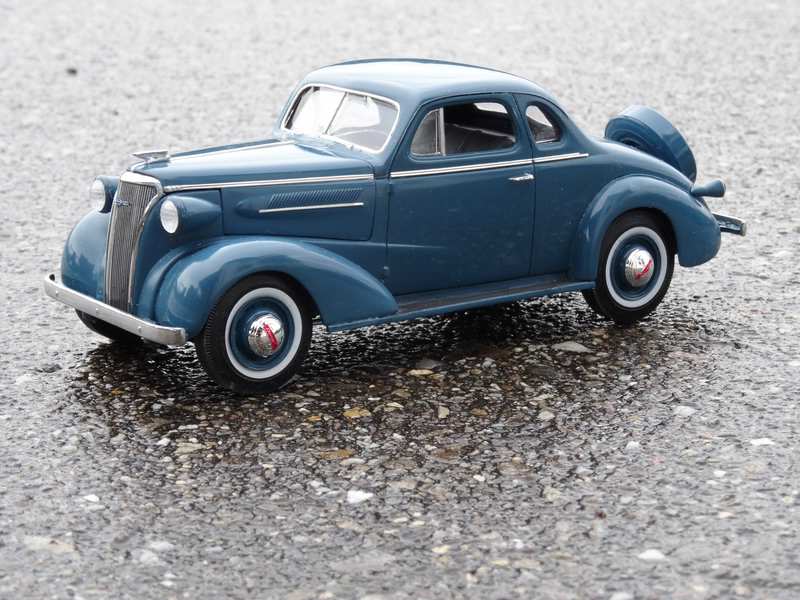 Somit schnell noch einen zweiten Bausatz bestellt und nochmals von vorn. Ja, nun ist er fertig. Farbe eine selber gemischte Mischung weiss/schwarz/blau von Tamiya aus dem Glas. Klarlack Mirgros Wasseracryl Glanzlack. Ok, der Glanz kommt dann erst nach schleifen und polieren. Gewöhnungsbedürftig ist bei den Chevys aus diesen Jahrgängen, dass nur ein Rücklicht vorhanden war. Den Grund kenne ich nicht. Seltsam auch, dass das eine Exemplar auf der Fahrerseite installiert wurde. Tja, andere Länder andere Sitten. Zusätzlich habe ich noch das Reserverad nach aussen verlegt. Normalerweise war das eine Option bei der Version mit Grossmutter Sitz. Aber diese Version des Continental Kits hat mich sehr angesprochen. Guckst du: