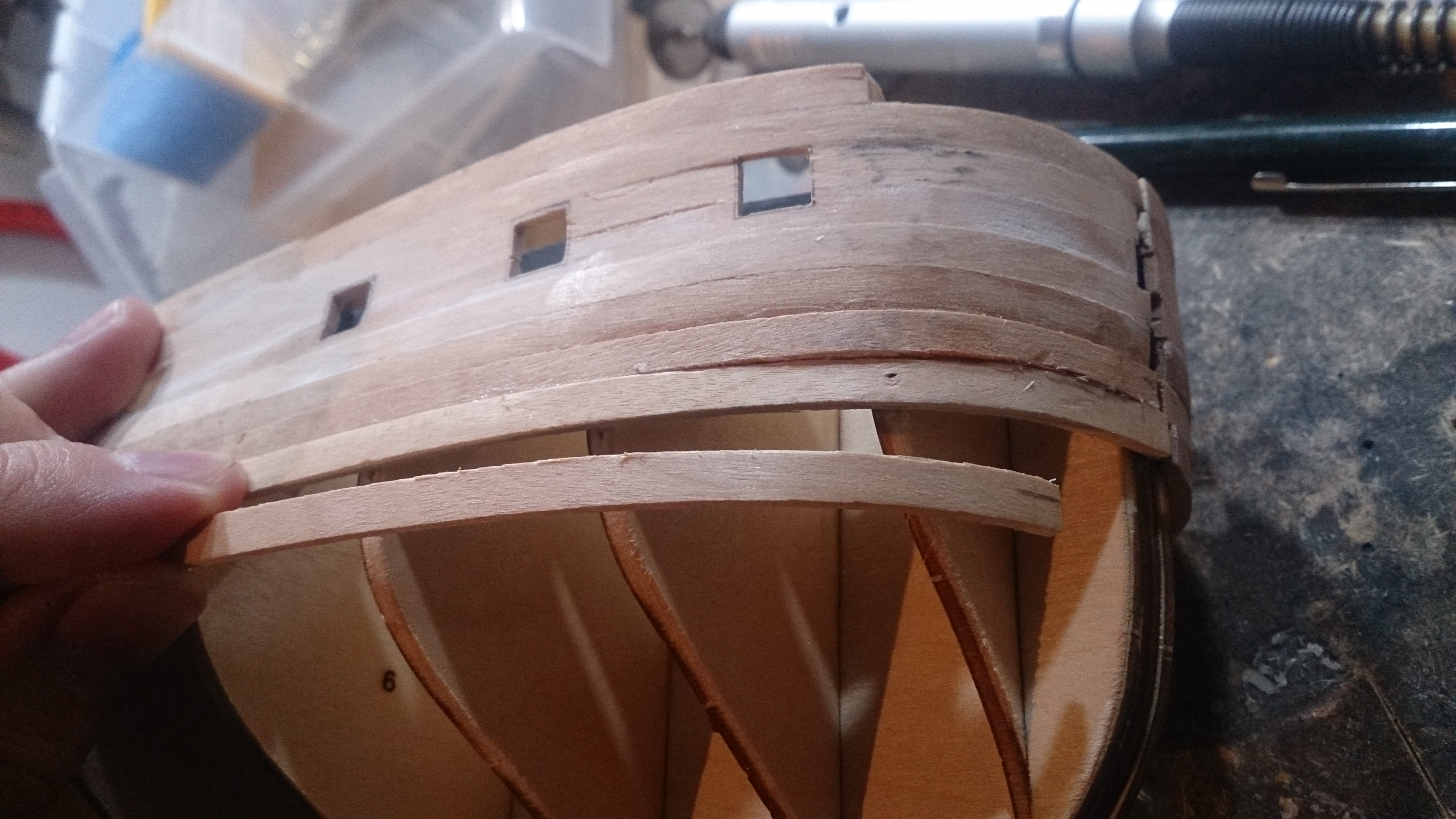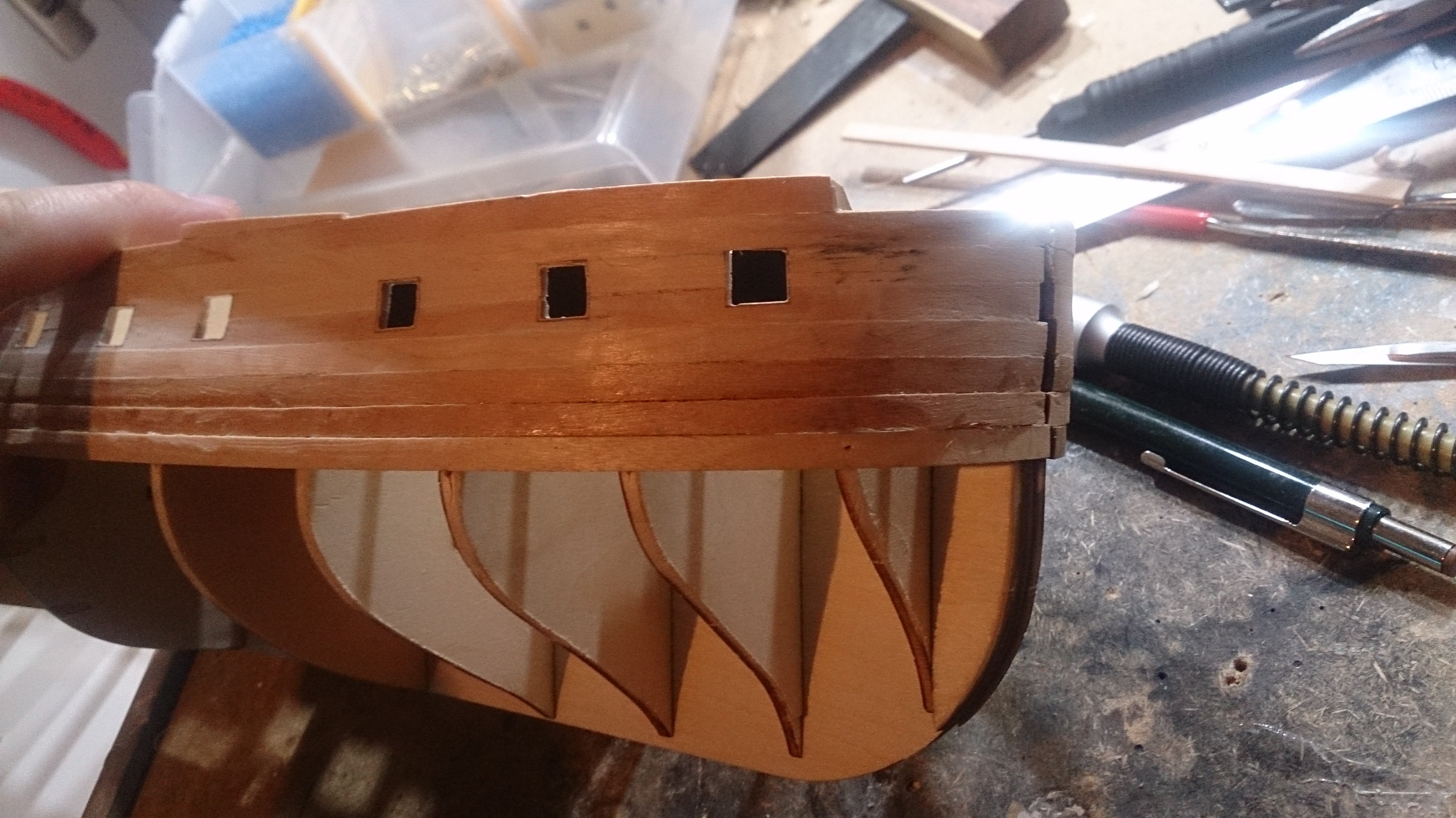 Und ein Tipp: Du solltest vor allem im unteren Bereich des Rumpfes die Planke etwas anfasen, damit sie lückenlos(-er) montiert werden können, falls Du das nicht bereits machst.