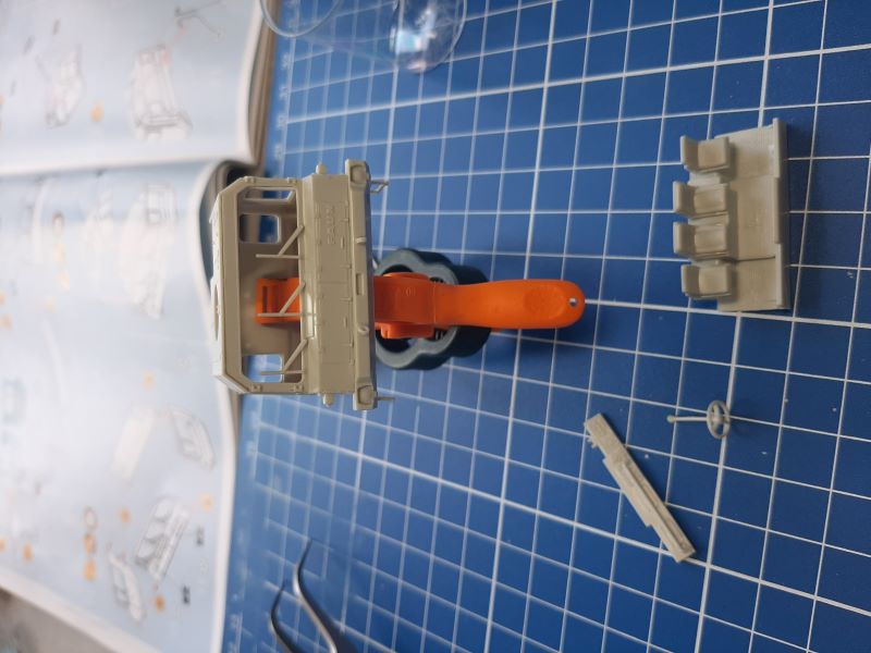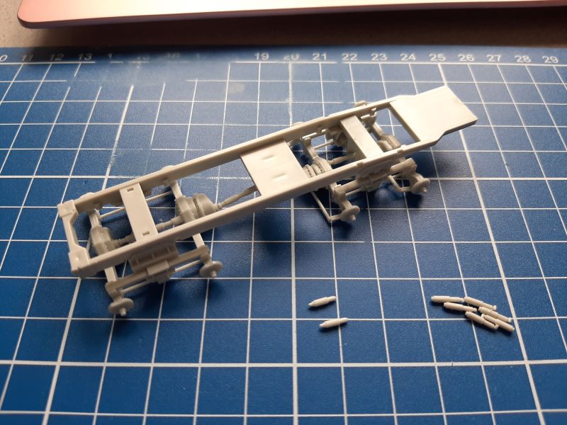 Der Anhänger war schon fordernd. Die teilweise sehr kleine Bauteile verlangen höchste Aufmerksamkeit, insbesondere beim Lösen vom Gußast. Alles in allem eine ziemliche Fummelei, den Anhänger auf ein Fahrwerk zu stellen.