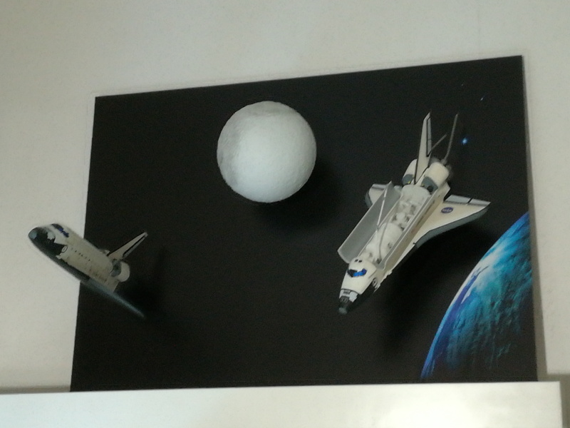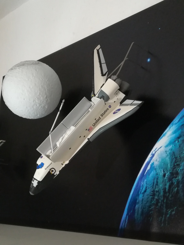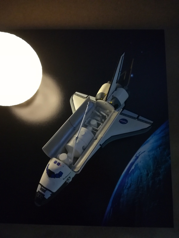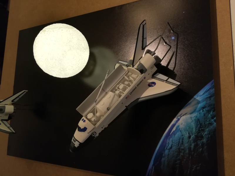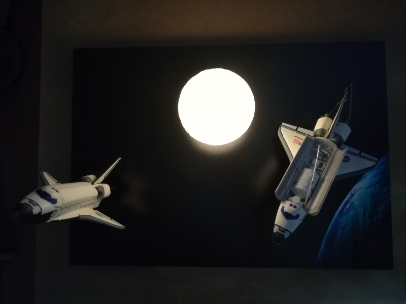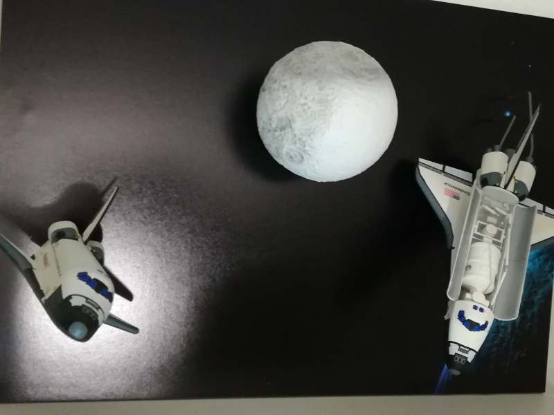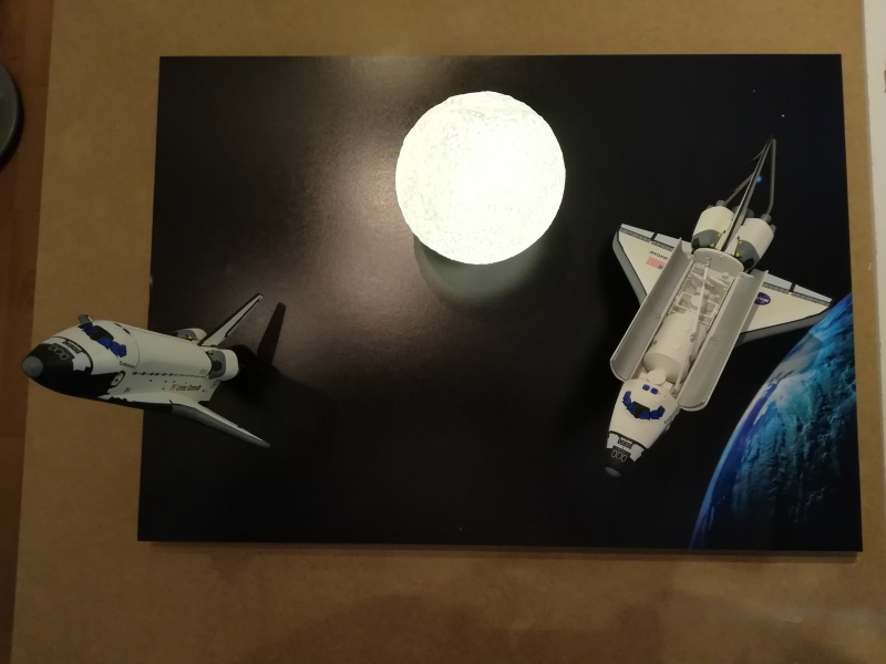 Nun ist das Diorama auch fertig so das ich auch ein paar Bilder davon zeigen kann. Den rechten Space Shuttle hab ich nochmal in der Position geändert so dass man die Befestigungsdrähte nun leider mehr sieht. Tut meines erachtens dem Gesamtbild aber keinen Abbruch.