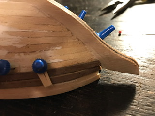 Der erste Spant am Bug ist ja nun recht klein und kann bald keine Planken mehr aufnehmen. Erweitere ich dann den Spant einfach oder lasse ich die weiteren Planken ohne „Stütze“ auf den Kiel auflaufen?
