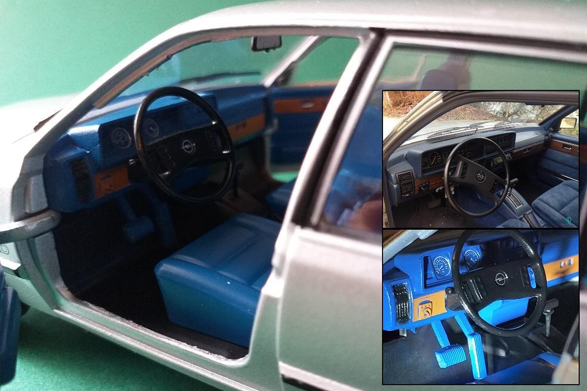 Kommen wir zum Innenraum. Die Bilder im Bild zeigen einmal das Vorbild und einmal unser Modell im Ausschnitt. Ich will jetzt keinen Roman schreiben, aber hier auch wieder alles korrekt modelliert aber dann farblich mangelhaft wieder gegeben. Armaturen einfach weiß auf blau gedruckt, die beiden Pedale auch in blau usw…. . Das Blau selber ist um Einiges zu hell, gleiches gilt für die hellbraunen Bereiche die das Holzdekor darstellen sollen. Ganz ehrlich, der Innenraum wirkt auf mich eher spielzeughaft. Davon war ich wirklich enttäuscht. Da spielt das falsche Opelzeichen anstelle des CD-Logos schon keine Rolle mehr.