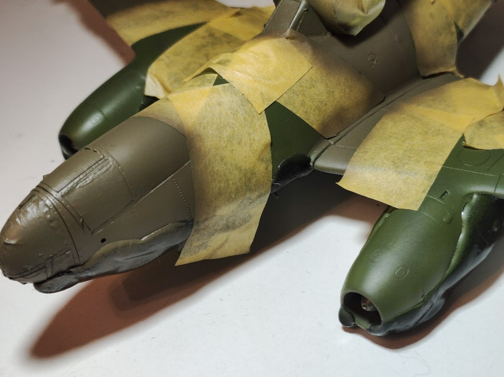 Anschließend habe ich RLM 82 flächig auf der Oberseite aufgetragen. Zum Abtrennen mit der Unterseite nutze ich eine polnische Maskierknete, diese eignet sich für unregelmäßige Muster ganz gut. Nach dem Grün wurde mit Maskingtape die Tarnung abgeklebt und mit RLM 83 die Flächen lackiert
