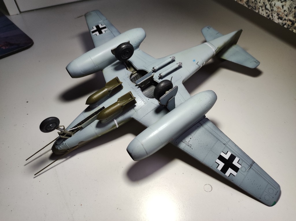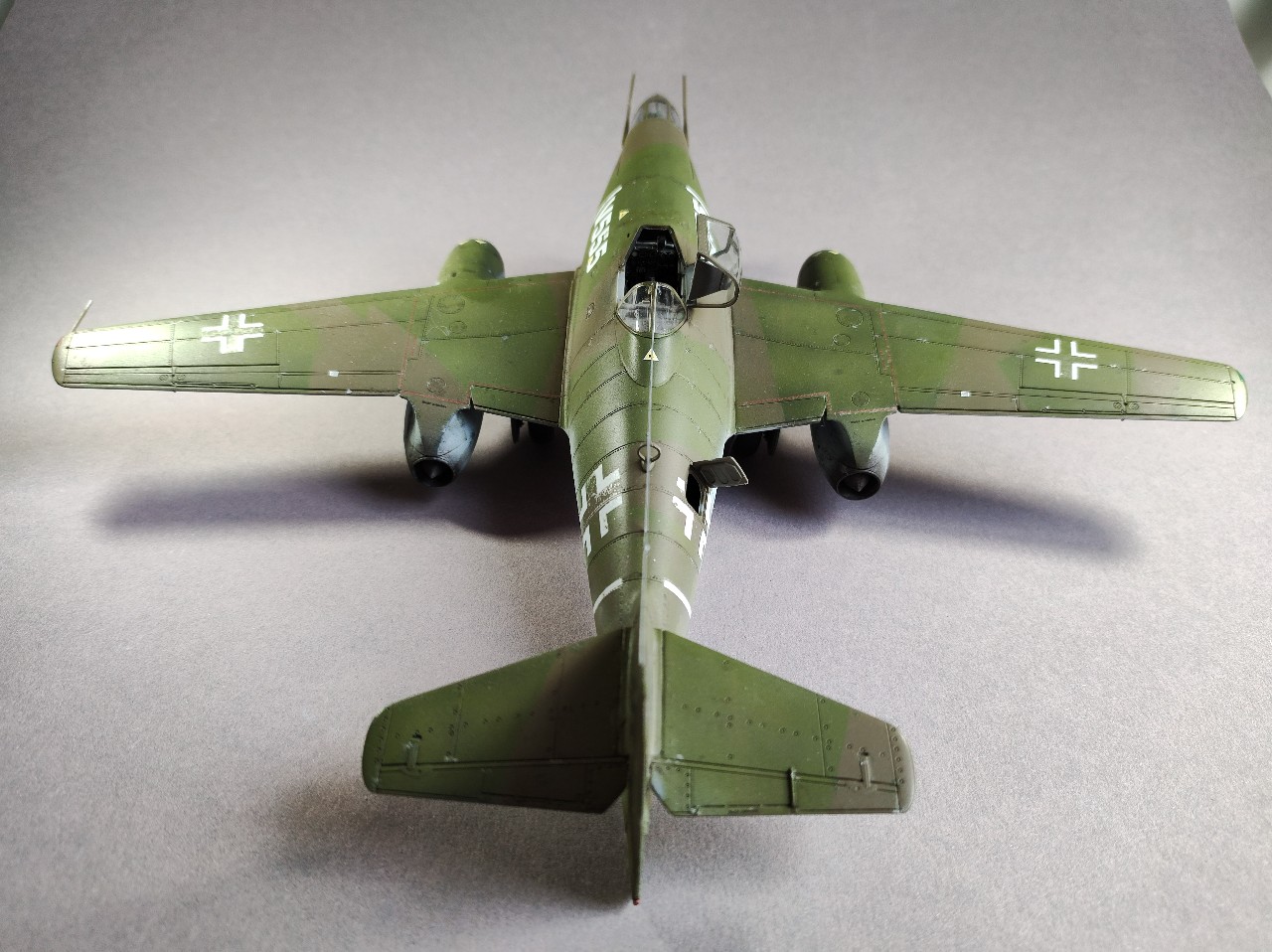 Der ein oder andere wird vielleicht diese Ausführung nicht kennen, daher sei kurz die Geschichte angeschnitten. Als man 1943 Hitler den Prototypen der Me262 vorstellte sitmmte diese nur unter der Bedingungen einer Serienproduktion zu, dass der Flieger ausschließlich als sogenannter Blitzbomber verwendet werden sollte. Nun war aber die Schwalbe als Abfangjäger konstituiert, so dass die Sicht auf mögliche Zeile sehr schlecht war und die Treffgenauigkeit fast bei Null lag. Eine Idee diese zur erhöhen, sah man darin in der Nase Platz für einen Bombenschützen zu schaffen. Immerhin zwei Exemplare wurden zur Erprobung gebaut