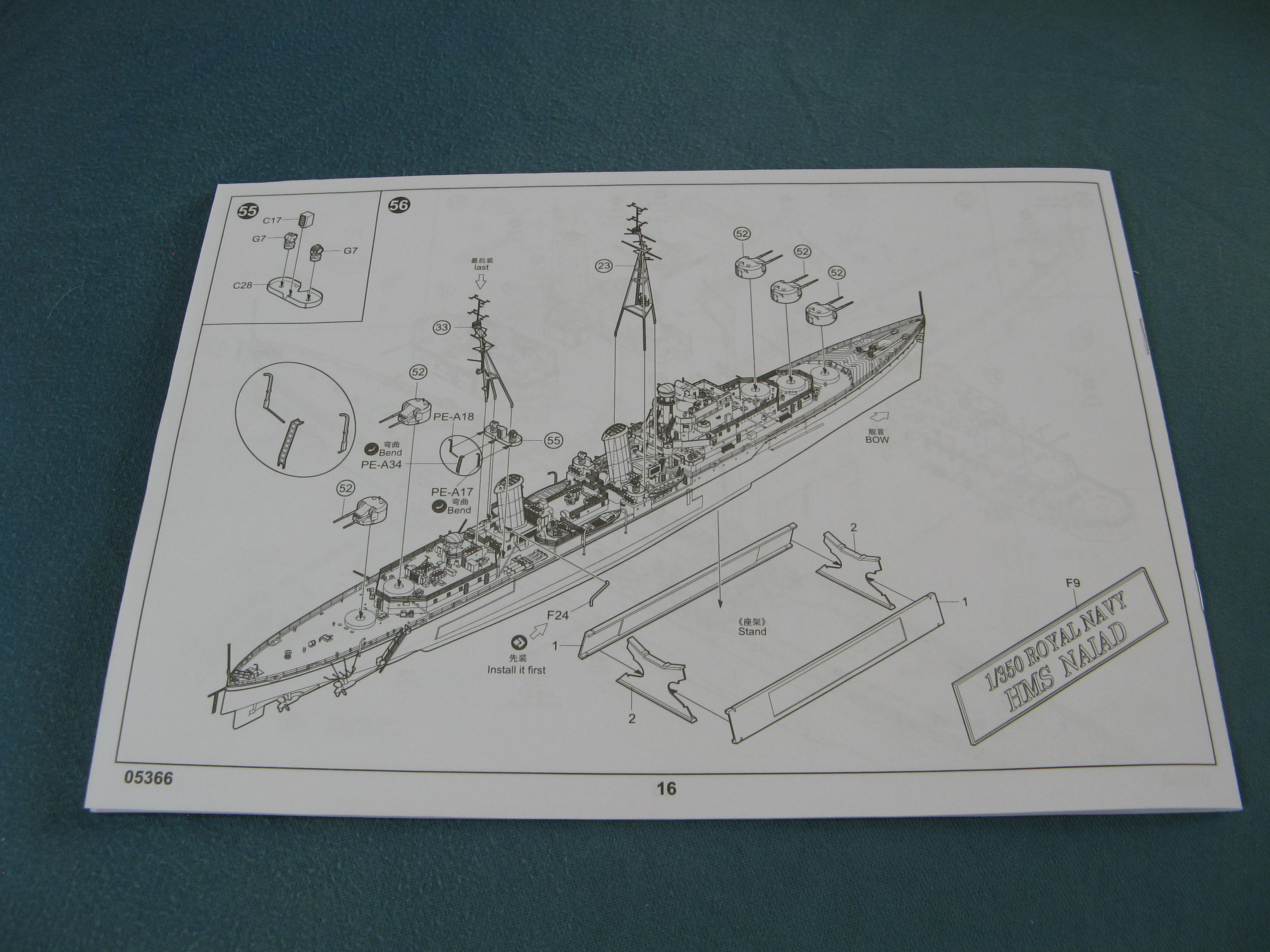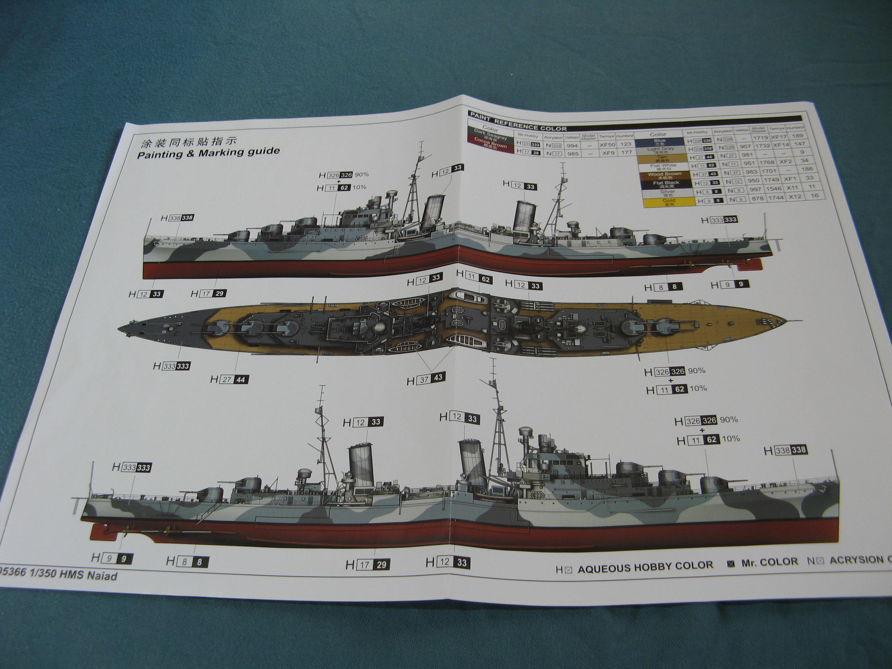 Modell: HMS Naiad (um 1941) Hersteller: Trumpeter Modellnr.:05366 Masstab: 1:350 Teile: 600+ Spritzlinge: 16 (+4 einzelne Deckaufbauten da es von Trumpeter mit der HMS Argonaut noch einen 2. wohl späteren Flakkreuzer der Dido-Klasse gibt die da etwas anders aussehn dürfte) 6 PE-Platinen Preis: um 65€ Herstellungsjahr: 2024 Verfügbarkeit: verfügbar Besonderheiten: wohl die ersten Kreuzer der Dido-Klasse in 1:350